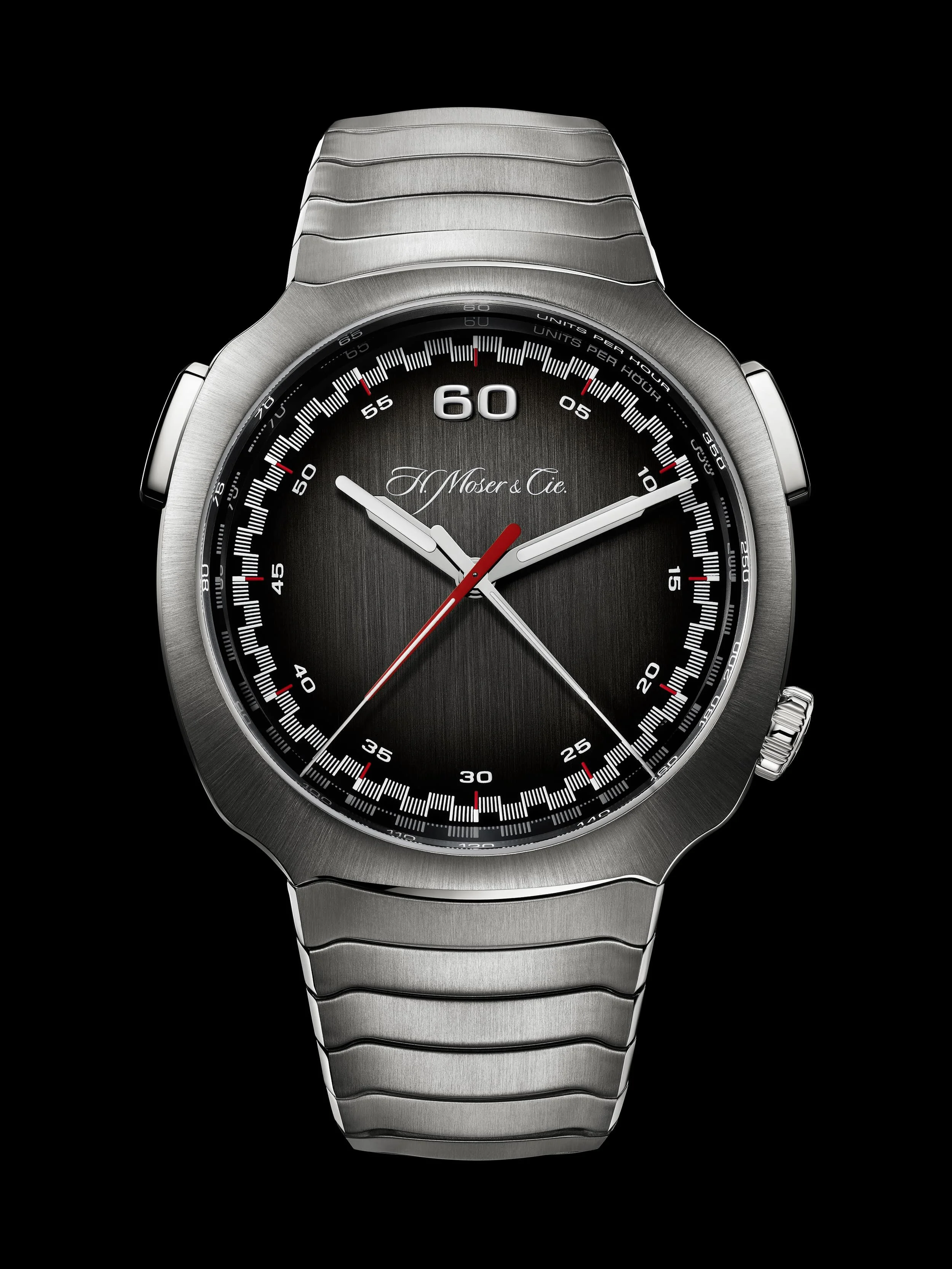 El brazalete de acero integrado es el elemento central de la identidad visual de este reloj y que atrae poderosamente la atención. Sus eslabones articulados presentan una superficie con satinado vertical y bordes curvados pulidos y, con un diseño muy ergonómico y que aporta comodidad. El cierre es desplegable con el escudo de H. Moser & Cie grabado.