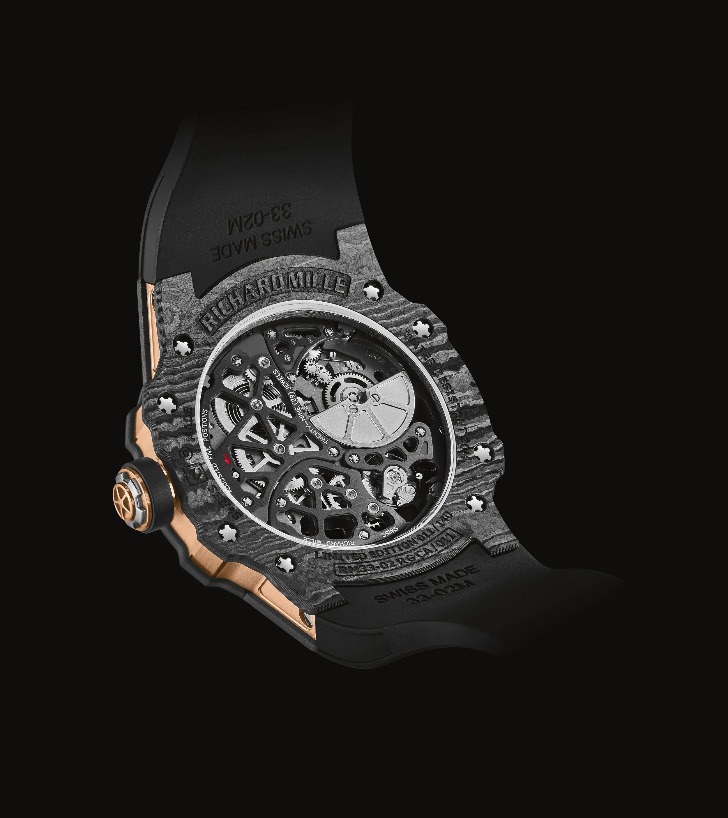 Los biseles frontal y trasero están hechos de carbono TPT, que es un material muy curioso y característico de Richard Mille con un acabado único obtenido mediante la colocación sucesiva de finas capas de fibras de carbono gracias a un proceso automatizado quecambia la orientación de la trama entre las distintas capas.